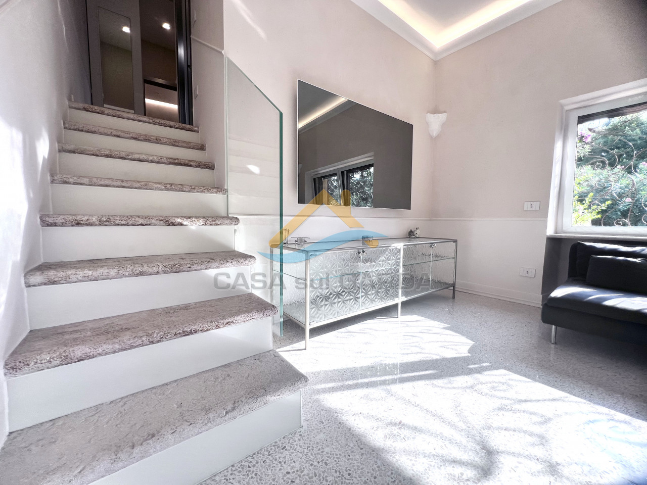 L’accesso alla proprietà avviene tramite il cancello principale del residence; tre gradini conducono al porticato d’ingresso che anticipa l’abitazione, che si sviluppa su più livelli:
