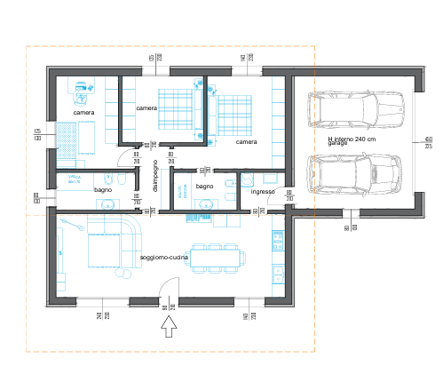 Die Villen werden aus folgenden Räumen bestehen: Eingang, Wohnzimmer mit Wohnküche, n.3 Schlafzimmer, Flur, n.2 Bäder und Doppelgarage;